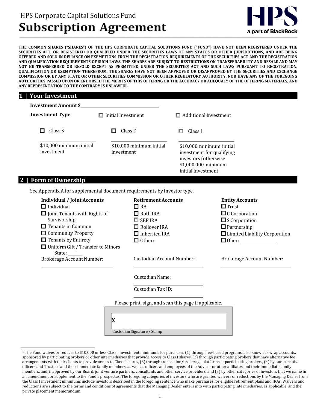 THE COMMON SHARES (“SHARES”) OF THE HPS CORPORATE CAPITAL SOLUTIONS FUND (“FUND”) HAVE NOT BEEN REGISTERED UNDER THE SECURITIES ACT, OR REGISTERED OR QUALIFIED UNDER THE SECURITIES LAWS OF ANY STATES OR OTHER JURISDICTIONS, AND ARE BEING OFFERED AND SOLD IN RELIANCE ON EXEMPTIONS FROM THE REGISTRATION REQUIREMENTS OF THE SECURITIES ACT AND THE REGISTRATION AND QUALIFICATION REQUIREMENTS OF SUCH LAWS. THE SHARES ARE SUBJECT TO RESTRICTIONS ON TRANSFERABILITY AND RESALE AND MAY NOT BE TRANSFERRED OR RESOLD EXCEPT AS PERMITTED UNDER THE SECURITIES ACT AND SUCH LAWS PURSUANT TO REGISTRATION, QUALIFICATION OR EXEMPTION THEREFROM. THE SHARES HAVE NOT BEEN APPROVED OR DISAPPROVED BY THE SECURITIES AND EXCHANGE COMMISSION OR BY ANY STATE OR OTHER SECURITIES COMMISSION OR OTHER REGULATORY AUTHORITY, NOR HAVE ANY OF THE FOREGOING AUTHORITIES PASSED UPON OR ENDORSED THE MERITS OF THIS OFFERING OR THE ACCURACY OR ADEQUACY OF THE OFFERING MATERIALS, AND ANY REPRESENTATION TO THE CONTRARY IS UNLAWFUL. 1 | Your Investment ☐ Initial Investment ☐ Additional Investment Investment Amount $ Investment Type Class S Class I $10,000 minimum initial investment $10,000 minimum initial investment $10,000 minimum initial investment for qualifying investors (otherwise $1,000,000 minimum initial investment 2 | Form of Ownership See Appendix A for supplemental document requirements by investor type. Individual / Joint Accounts ☐ Individual ☐ Joint Tenants with Rights of Survivorship ☐ Tenants in Common ☐ Community Property ☐ Tenants by Entirety ☐ Uniform Gift / Transfer to Minors State: Brokerage Account Number: Retirement Accounts ☐ RA ☐ Roth IRA ☐ SEP IRA ☐ Rollover IRA ☐ Inherited IRA ☐ Other: Custodian Account Number: Entity Accounts ☐ Trust ☐ C Corporation ☐ S Corporation ☐ Partnership ☐ Limited Liability Corporation ☐ Oher: Brokerage Account Number: Custodian Name: Custodian Tax ID: Please print, sign, and scan this page if applicable. 1 The Fund waives or reduces to $10,000 or less Class I investment minimums for purchases (1) through fee-based programs, also known as wrap accounts, sponsored by participating brokers or other intermediaries that provide access to Class I shares, (2) through participating brokers that have alternative fee arrangements with their clients to provide access to Class I shares, (3) through transaction/brokerage platforms at participating brokers, (4) by our executive officers and Trustees and their immediate family members, as well as officers and employees of the Adviser or other affiliates and their immediate family members, and, if approved by our Board, joint venture partners, consultants and other service providers, and (5) by other categories of investors that we name in an amendment or supplement to the Fund's prospectus. The foregoing categories of investors who are granted waivers or reductions by the Managing Dealer from the Class I investment minimums include investors described in the foregoing sentence who make purchases for eligible retirement plans and IRAs. Waivers and reductions are subject to the terms and conditions of agreements that the Managing Dealer enters into with participating intermediaries, as applicable, and the private placement memorandum. 1 HPS Corporate Capital Solutions Fund Custodian Signature / Stamp Class D