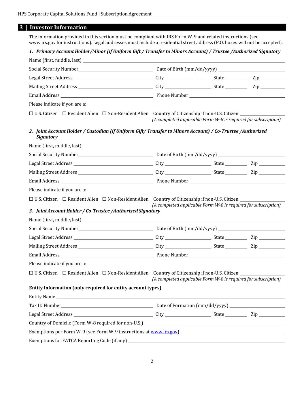 HPS Corporate Capital Solutions Fund | Subscription Agreement 2 3 | Investor Information The information provided in this section must be compliant with IRS Form W-9 and related instructions (see www.irs.gov for instructions). Legal addresses must include a residential street address (P.O. boxes will not be accepted). 1. Primary Account Holder/Minor (if Uniform Gift / Transfer to Minors Account) / Trustee /Authorized Signatory Name (first, middle, last) Social Security Number Date of Birth (mm/dd/yyyy) Legal Street Address City State Zip Mailing Street Address City State Zip Email Address Phone Number Please indicate if you are a: ☐ U.S. Citizen ☐ Resident Alien ☐ Non-Resident Alien Country of Citizenship if non-U.S. Citizen (A completed applicable Form W-8 is required for subscription) 2. Joint Account Holder / Custodian (if Uniform Gift/ Transfer to Minors Account) / Co-Trustee /Authorized Signatory Name (first, middle, last) Social Security Number Date of Birth (mm/dd/yyyy) Legal Street Address City State Zip Mailing Street Address City State Zip Email Address Phone Number Please indicate if you are a: ☐ U.S. Citizen ☐ Resident Alien ☐ Non-Resident Alien Country of Citizenship if non-U.S. Citizen (A completed applicable Form W-8 is required for subscription) 3. Joint Account Holder / Co-Trustee /Authorized Signatory Name (first, middle, last) Social Security Number Date of Birth (mm/dd/yyyy) Legal Street Address City State Zip Mailing Street Address City State Zip Email Address Phone Number Please indicate if you are a: ☐ U.S. Citizen ☐ Resident Alien ☐ Non-Resident Alien Country of Citizenship if non-U.S. Citizen (A completed applicable Form W-8 is required for subscription) Entity Information (only required for entity account types) Entity Name Tax ID Number Date of Formation (mm/dd/yyyy) Legal Street Address City State Zip Country of Domicile (Form W-8 required for non-U.S.) Exemptions per Form W-9 (see Form W-9 instructions at www.irs.gov) Exemptions for FATCA Reporting Code (if any)