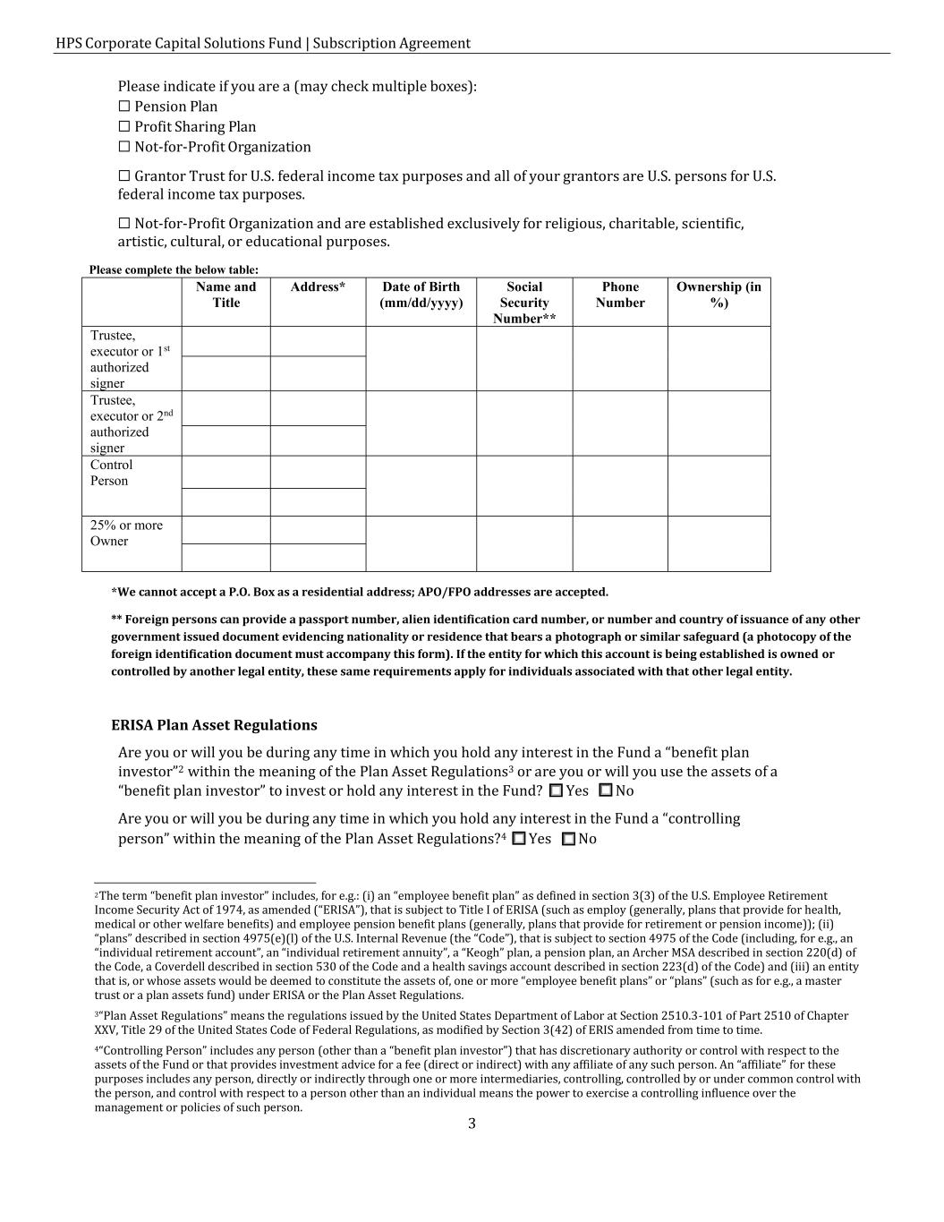 HPS Corporate Capital Solutions Fund | Subscription Agreement 3 Please indicate if you are a (may check multiple boxes): ☐ Pension Plan ☐ Profit Sharing Plan ☐ Not-for-Profit Organization ☐ Grantor Trust for U.S. federal income tax purposes and all of your grantors are U.S. persons for U.S. federal income tax purposes. ☐ Not-for-Profit Organization and are established exclusively for religious, charitable, scientific, artistic, cultural, or educational purposes. Please complete the below table: Name and Title Address* Date of Birth (mm/dd/yyyy) Social Security Number** Phone Number Ownership (in %) Trustee, executor or 1st authorized signer Trustee, executor or 2nd authorized signer Control Person 25% or more Owner *We cannot accept a P.O. Box as a residential address; APO/FPO addresses are accepted. ** Foreign persons can provide a passport number, alien identification card number, or number and country of issuance of any other government issued document evidencing nationality or residence that bears a photograph or similar safeguard (a photocopy of the foreign identification document must accompany this form). If the entity for which this account is being established is owned or controlled by another legal entity, these same requirements apply for individuals associated with that other legal entity. ERISA Plan Asset Regulations Are you or will you be during any time in which you hold any interest in the Fund a “benefit plan investor”2 within the meaning of the Plan Asset Regulations3 or are you or will you use the assets of a “benefit plan investor” to invest or hold any interest in the Fund? ☐ Yes ☐ No Are you or will you be during any time in which you hold any interest in the Fund a “controlling person” within the meaning of the Plan Asset Regulations?4 ☐ Yes ☐ No 2 The term “benefit plan investor” includes, for e.g.: (i) an “employee benefit plan” as defined in section 3(3) of the U.S. Employee Retirement Income Security Act of 1974, as amended (“ERISA”), that is subject to Title I of ERISA (such as employ (generally, plans that provide for health, medical or other welfare benefits) and employee pension benefit plans (generally, plans that provide for retirement or pension income)); (ii) “plans” described in section 4975(e)(l) of the U.S. Internal Revenue (the “Code”), that is subject to section 4975 of the Code (including, for e.g., an “individual retirement account”, an “individual retirement annuity”, a “Keogh” plan, a pension plan, an Archer MSA described in section 220(d) of the Code, a Coverdell described in section 530 of the Code and a health savings account described in section 223(d) of the Code) and (iii) an entity that is, or whose assets would be deemed to constitute the assets of, one or more “employee benefit plans” or “plans” (such as for e.g., a master trust or a plan assets fund) under ERISA or the Plan Asset Regulations. 3“Plan Asset Regulations” means the regulations issued by the United States Department of Labor at Section 2510.3-101 of Part 2510 of Chapter XXV, Title 29 of the United States Code of Federal Regulations, as modified by Section 3(42) of ERIS amended from time to time. 4“Controlling Person” includes any person (other than a “benefit plan investor”) that has discretionary authority or control with respect to the assets of the Fund or that provides investment advice for a fee (direct or indirect) with any affiliate of any such person. An “affiliate” for these purposes includes any person, directly or indirectly through one or more intermediaries, controlling, controlled by or under common control with the person, and control with respect to a person other than an individual means the power to exercise a controlling influence over the management or policies of such person.