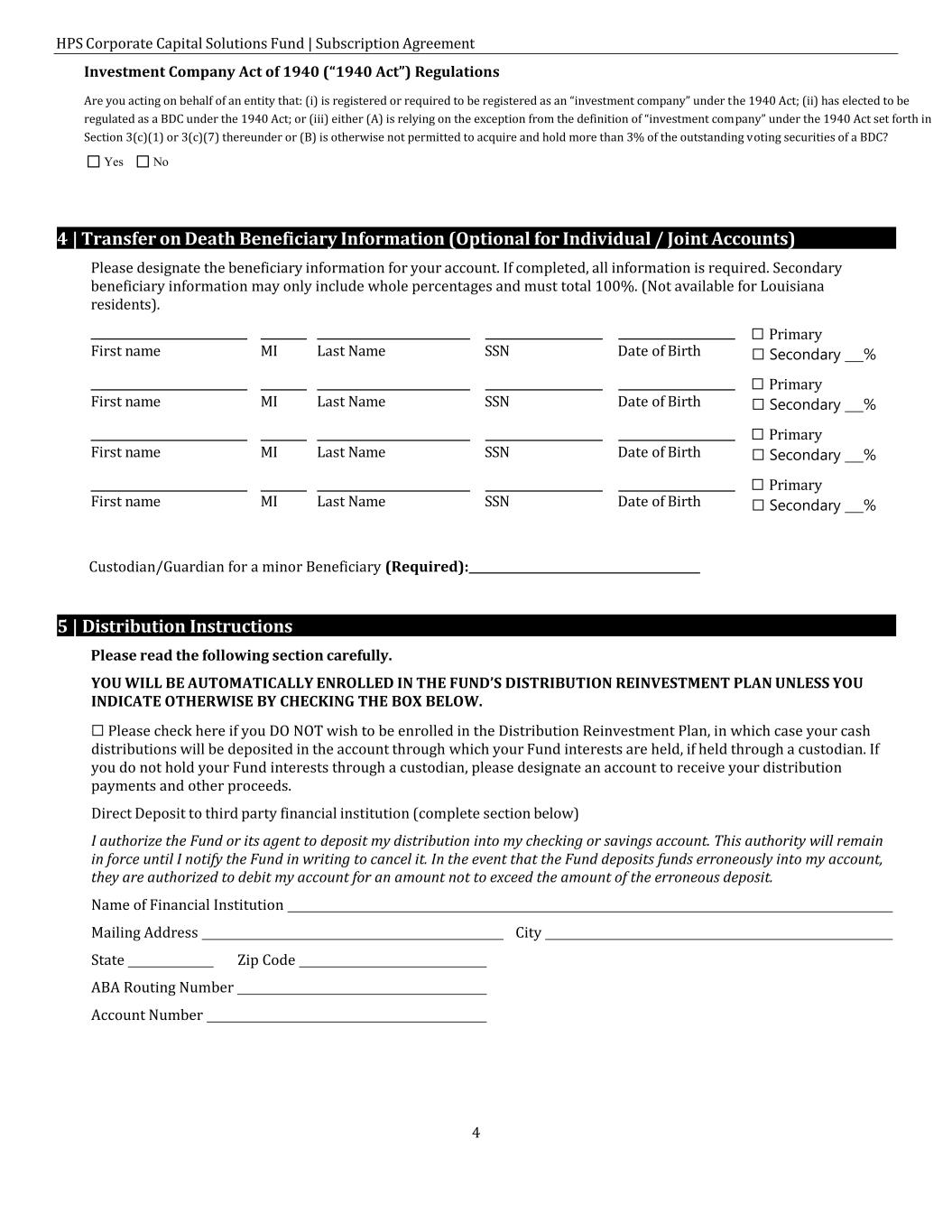 HPS Corporate Capital Solutions Fund | Subscription Agreement 4 Investment Company Act of 1940 (“1940 Act”) Regulations Are you acting on behalf of an entity that: (i) is registered or required to be registered as an “investment company” under the 1940 Act; (ii) has elected to be regulated as a BDC under the 1940 Act; or (iii) either (A) is relying on the exception from the definition of “investment company” under the 1940 Act set forth in Section 3(c)(1) or 3(c)(7) thereunder or (B) is otherwise not permitted to acquire and hold more than 3% of the outstanding voting securities of a BDC? Yes No 4 | Transfer on Death Beneficiary Information (Optional for Individual / Joint Accounts) Please designate the beneficiary information for your account. If completed, all information is required. Secondary beneficiary information may only include whole percentages and must total 100%. (Not available for Louisiana residents). ☐ Primary ☐ Secondary % ☐ Primary ☐ Secondary % ☐ Primary ☐ Secondary % ☐ Primary ☐ Secondary % Custodian/Guardian for a minor Beneficiary (Required): 5 | Distribution Instructions Please read the following section carefully. YOU WILL BE AUTOMATICALLY ENROLLED IN THE FUND’S DISTRIBUTION REINVESTMENT PLAN UNLESS YOU INDICATE OTHERWISE BY CHECKING THE BOX BELOW. ☐ Please check here if you DO NOT wish to be enrolled in the Distribution Reinvestment Plan, in which case your cash distributions will be deposited in the account through which your Fund interests are held, if held through a custodian. If you do not hold your Fund interests through a custodian, please designate an account to receive your distribution payments and other proceeds. Direct Deposit to third party financial institution (complete section below) I authorize the Fund or its agent to deposit my distribution into my checking or savings account. This authority will remain in force until I notify the Fund in writing to cancel it. In the event that the Fund deposits funds erroneously into my account, they are authorized to debit my account for an amount not to exceed the amount of the erroneous deposit. Name of Financial Institution Mailing Address City State Zip Code ABA Routing Number Account Number First name MI Last Name SSN Date of Birth First name MI Last Name SSN Date of Birth First name MI Last Name SSN Date of Birth First name MI Last Name SSN Date of Birth