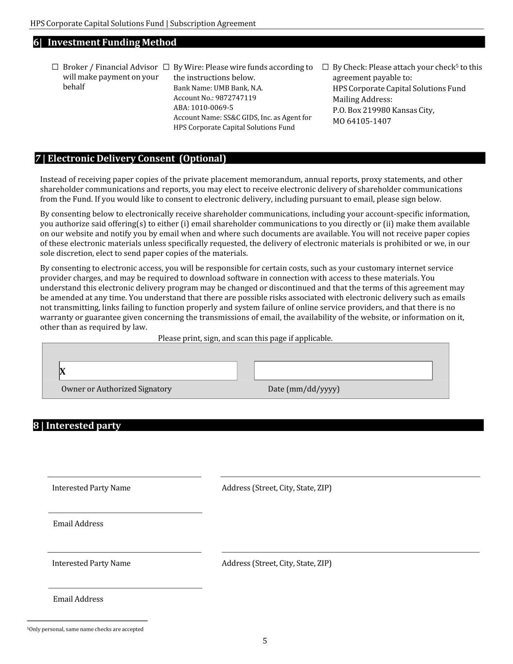 HPS Corporate Capital Solutions Fund | Subscription Agreement 5 6| Investment Funding Method ☐ Broker / Financial Advisor will make payment on your behalf ☐ By Wire: Please wire funds according to the instructions below. Bank Name: UMB Bank, N.A. Account No.: 9872747119 ABA: 1010-0069-5 Account Name: SS&C GIDS, Inc. as Agent for HPS Corporate Capital Solutions Fund ☐ By Check: Please attach your check5 to this agreement payable to: HPS Corporate Capital Solutions Fund Mailing Address: P.O. Box 219980 Kansas City, MO 64105-1407 5Only personal, same name checks are accepted 7 | Electronic Delivery Consent (Optional) Instead of receiving paper copies of the private placement memorandum, annual reports, proxy statements, and other shareholder communications and reports, you may elect to receive electronic delivery of shareholder communications from the Fund. If you would like to consent to electronic delivery, including pursuant to email, please sign below. By consenting below to electronically receive shareholder communications, including your account-specific information, you authorize said offering(s) to either (i) email shareholder communications to you directly or (ii) make them available on our website and notify you by email when and where such documents are available. You will not receive paper copies of these electronic materials unless specifically requested, the delivery of electronic materials is prohibited or we, in our sole discretion, elect to send paper copies of the materials. By consenting to electronic access, you will be responsible for certain costs, such as your customary internet service provider charges, and may be required to download software in connection with access to these materials. You understand this electronic delivery program may be changed or discontinued and that the terms of this agreement may be amended at any time. You understand that there are possible risks associated with electronic delivery such as emails not transmitting, links failing to function properly and system failure of online service providers, and that there is no warranty or guarantee given concerning the transmissions of email, the availability of the website, or information on it, other than as required by law. Please print, sign, and scan this page if applicable. Owner or Authorized Signatory Date (mm/dd/yyyy) 8 | Interested party Interested Party Name Address (Street, City, State, ZIP) Email Address Interested Party Name Address (Street, City, State, ZIP) Email Address