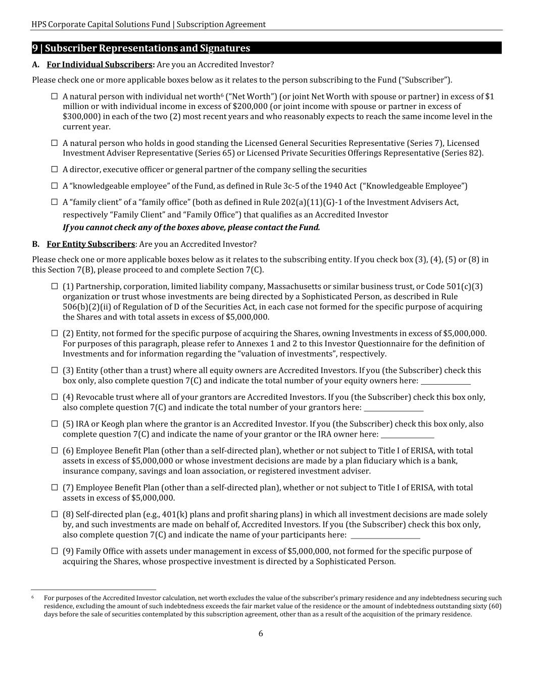 HPS Corporate Capital Solutions Fund | Subscription Agreement 6 9 | Subscriber Representations and Signatures A. For Individual Subscribers: Are you an Accredited Investor? Please check one or more applicable boxes below as it relates to the person subscribing to the Fund (“Subscriber”). ☐ A natural person with individual net worth6 (“Net Worth”) (or joint Net Worth with spouse or partner) in excess of $1 million or with individual income in excess of $200,000 (or joint income with spouse or partner in excess of $300,000) in each of the two (2) most recent years and who reasonably expects to reach the same income level in the current year. ☐ A natural person who holds in good standing the Licensed General Securities Representative (Series 7), Licensed Investment Adviser Representative (Series 65) or Licensed Private Securities Offerings Representative (Series 82). ☐ A director, executive officer or general partner of the company selling the securities ☐ A “knowledgeable employee” of the Fund, as defined in Rule 3c-5 of the 1940 Act (“Knowledgeable Employee”) ☐ A “family client” of a “family office” (both as defined in Rule 202(a)(11)(G)-1 of the Investment Advisers Act, respectively “Family Client” and “Family Office”) that qualifies as an Accredited Investor If you cannot check any of the boxes above, please contact the Fund. B. For Entity Subscribers: Are you an Accredited Investor? Please check one or more applicable boxes below as it relates to the subscribing entity. If you check box (3), (4), (5) or (8) in this Section 7(B), please proceed to and complete Section 7(C). ☐ (1) Partnership, corporation, limited liability company, Massachusetts or similar business trust, or Code 501(c)(3) organization or trust whose investments are being directed by a Sophisticated Person, as described in Rule 506(b)(2)(ii) of Regulation of D of the Securities Act, in each case not formed for the specific purpose of acquiring the Shares and with total assets in excess of $5,000,000. ☐ (2) Entity, not formed for the specific purpose of acquiring the Shares, owning Investments in excess of $5,000,000. For purposes of this paragraph, please refer to Annexes 1 and 2 to this Investor Questionnaire for the definition of Investments and for information regarding the “valuation of investments”, respectively. ☐ (3) Entity (other than a trust) where all equity owners are Accredited Investors. If you (the Subscriber) check this box only, also complete question 7(C) and indicate the total number of your equity owners here: ☐ (4) Revocable trust where all of your grantors are Accredited Investors. If you (the Subscriber) check this box only, also complete question 7(C) and indicate the total number of your grantors here: ☐ (5) IRA or Keogh plan where the grantor is an Accredited Investor. If you (the Subscriber) check this box only, also complete question 7(C) and indicate the name of your grantor or the IRA owner here: ☐ (6) Employee Benefit Plan (other than a self-directed plan), whether or not subject to Title I of ERISA, with total assets in excess of $5,000,000 or whose investment decisions are made by a plan fiduciary which is a bank, insurance company, savings and loan association, or registered investment adviser. ☐ (7) Employee Benefit Plan (other than a self-directed plan), whether or not subject to Title I of ERISA, with total assets in excess of $5,000,000. ☐ (8) Self-directed plan (e.g., 401(k) plans and profit sharing plans) in which all investment decisions are made solely by, and such investments are made on behalf of, Accredited Investors. If you (the Subscriber) check this box only, also complete question 7(C) and indicate the name of your participants here: ☐ (9) Family Office with assets under management in excess of $5,000,000, not formed for the specific purpose of acquiring the Shares, whose prospective investment is directed by a Sophisticated Person. 6 For purposes of the Accredited Investor calculation, net worth excludes the value of the subscriber’s primary residence and any indebtedness securing such residence, excluding the amount of such indebtedness exceeds the fair market value of the residence or the amount of indebtedness outstanding sixty (60) days before the sale of securities contemplated by this subscription agreement, other than as a result of the acquisition of the primary residence.