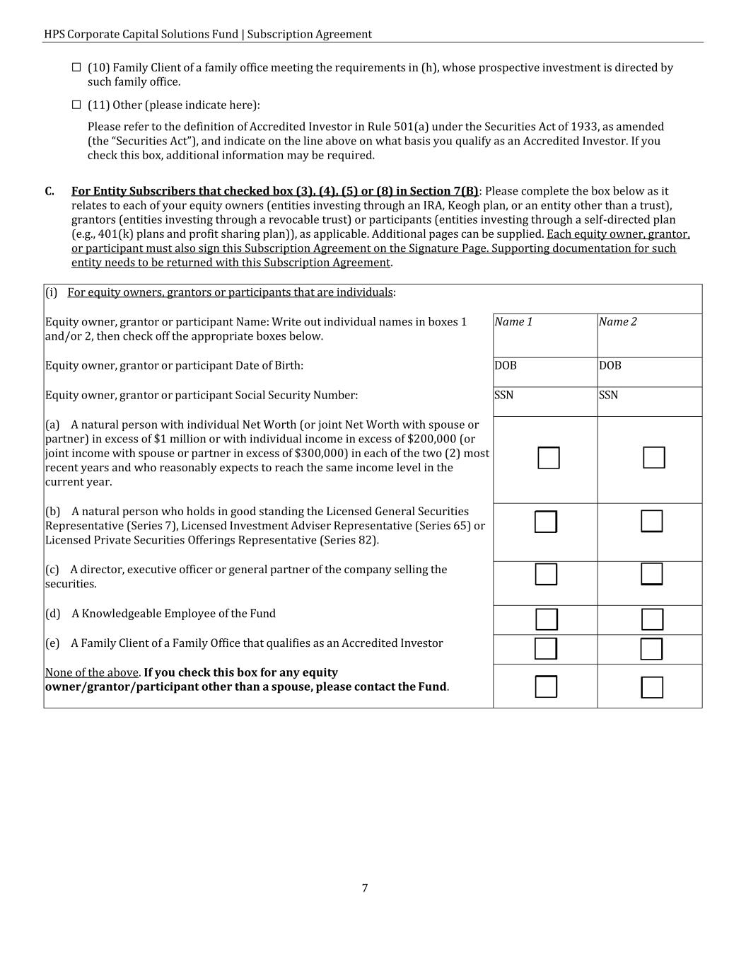 HPS Corporate Capital Solutions Fund | Subscription Agreement 7 ☐ (10) Family Client of a family office meeting the requirements in (h), whose prospective investment is directed by such family office. ☐ (11) Other (please indicate here): Please refer to the definition of Accredited Investor in Rule 501(a) under the Securities Act of 1933, as amended (the “Securities Act”), and indicate on the line above on what basis you qualify as an Accredited Investor. If you check this box, additional information may be required. C. For Entity Subscribers that checked box (3), (4), (5) or (8) in Section 7(B): Please complete the box below as it relates to each of your equity owners (entities investing through an IRA, Keogh plan, or an entity other than a trust), grantors (entities investing through a revocable trust) or participants (entities investing through a self-directed plan (e.g., 401(k) plans and profit sharing plan)), as applicable. Additional pages can be supplied. Each equity owner, grantor, or participant must also sign this Subscription Agreement on the Signature Page. Supporting documentation for such entity needs to be returned with this Subscription Agreement. (i) For equity owners, grantors or participants that are individuals: Equity owner, grantor or participant Name: Write out individual names in boxes 1 and/or 2, then check off the appropriate boxes below. Equity owner, grantor or participant Date of Birth: Equity owner, grantor or participant Social Security Number: (a) A natural person with individual Net Worth (or joint Net Worth with spouse or partner) in excess of $1 million or with individual income in excess of $200,000 (or joint income with spouse or partner in excess of $300,000) in each of the two (2) most recent years and who reasonably expects to reach the same income level in the current year. (b) A natural person who holds in good standing the Licensed General Securities Representative (Series 7), Licensed Investment Adviser Representative (Series 65) or Licensed Private Securities Offerings Representative (Series 82). (c) A director, executive officer or general partner of the company selling the securities. (d) A Knowledgeable Employee of the Fund (e) A Family Client of a Family Office that qualifies as an Accredited Investor None of the above. If you check this box for any equity owner/grantor/participant other than a spouse, please contact the Fund. Name 1 Name 2 DOB DOB SSN SSN