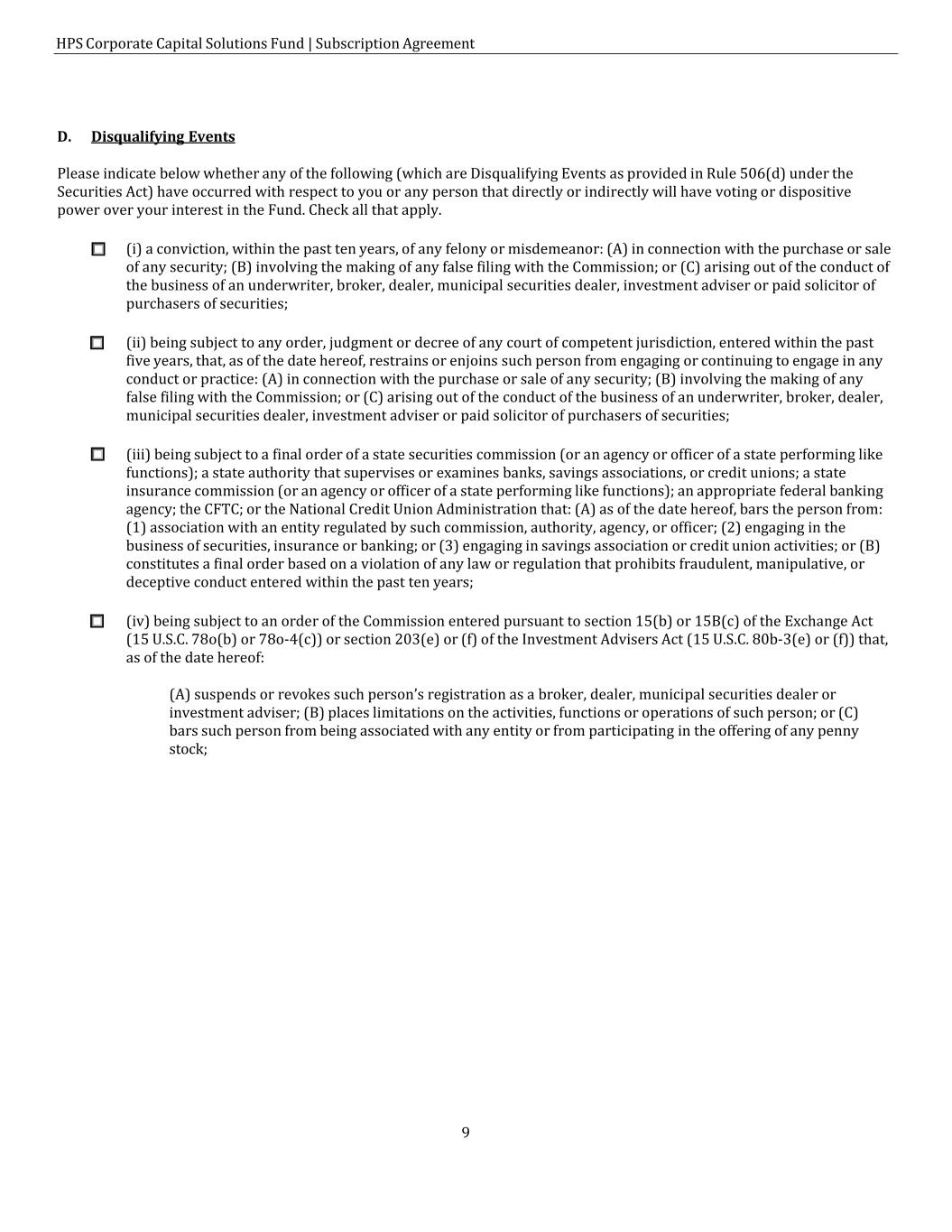 HPS Corporate Capital Solutions Fund | Subscription Agreement 9 D. Disqualifying Events Please indicate below whether any of the following (which are Disqualifying Events as provided in Rule 506(d) under the Securities Act) have occurred with respect to you or any person that directly or indirectly will have voting or dispositive power over your interest in the Fund. Check all that apply. ☐ (i) a conviction, within the past ten years, of any felony or misdemeanor: (A) in connection with the purchase or sale of any security; (B) involving the making of any false filing with the Commission; or (C) arising out of the conduct of the business of an underwriter, broker, dealer, municipal securities dealer, investment adviser or paid solicitor of purchasers of securities; ☐ (ii) being subject to any order, judgment or decree of any court of competent jurisdiction, entered within the past five years, that, as of the date hereof, restrains or enjoins such person from engaging or continuing to engage in any conduct or practice: (A) in connection with the purchase or sale of any security; (B) involving the making of any false filing with the Commission; or (C) arising out of the conduct of the business of an underwriter, broker, dealer, municipal securities dealer, investment adviser or paid solicitor of purchasers of securities; ☐ (iii) being subject to a final order of a state securities commission (or an agency or officer of a state performing like functions); a state authority that supervises or examines banks, savings associations, or credit unions; a state insurance commission (or an agency or officer of a state performing like functions); an appropriate federal banking agency; the CFTC; or the National Credit Union Administration that: (A) as of the date hereof, bars the person from: (1) association with an entity regulated by such commission, authority, agency, or officer; (2) engaging in the business of securities, insurance or banking; or (3) engaging in savings association or credit union activities; or (B) constitutes a final order based on a violation of any law or regulation that prohibits fraudulent, manipulative, or deceptive conduct entered within the past ten years; ☐ (iv) being subject to an order of the Commission entered pursuant to section 15(b) or 15B(c) of the Exchange Act (15 U.S.C. 78o(b) or 78o-4(c)) or section 203(e) or (f) of the Investment Advisers Act (15 U.S.C. 80b-3(e) or (f)) that, as of the date hereof: (A) suspends or revokes such person’s registration as a broker, dealer, municipal securities dealer or investment adviser; (B) places limitations on the activities, functions or operations of such person; or (C) bars such person from being associated with any entity or from participating in the offering of any penny stock;