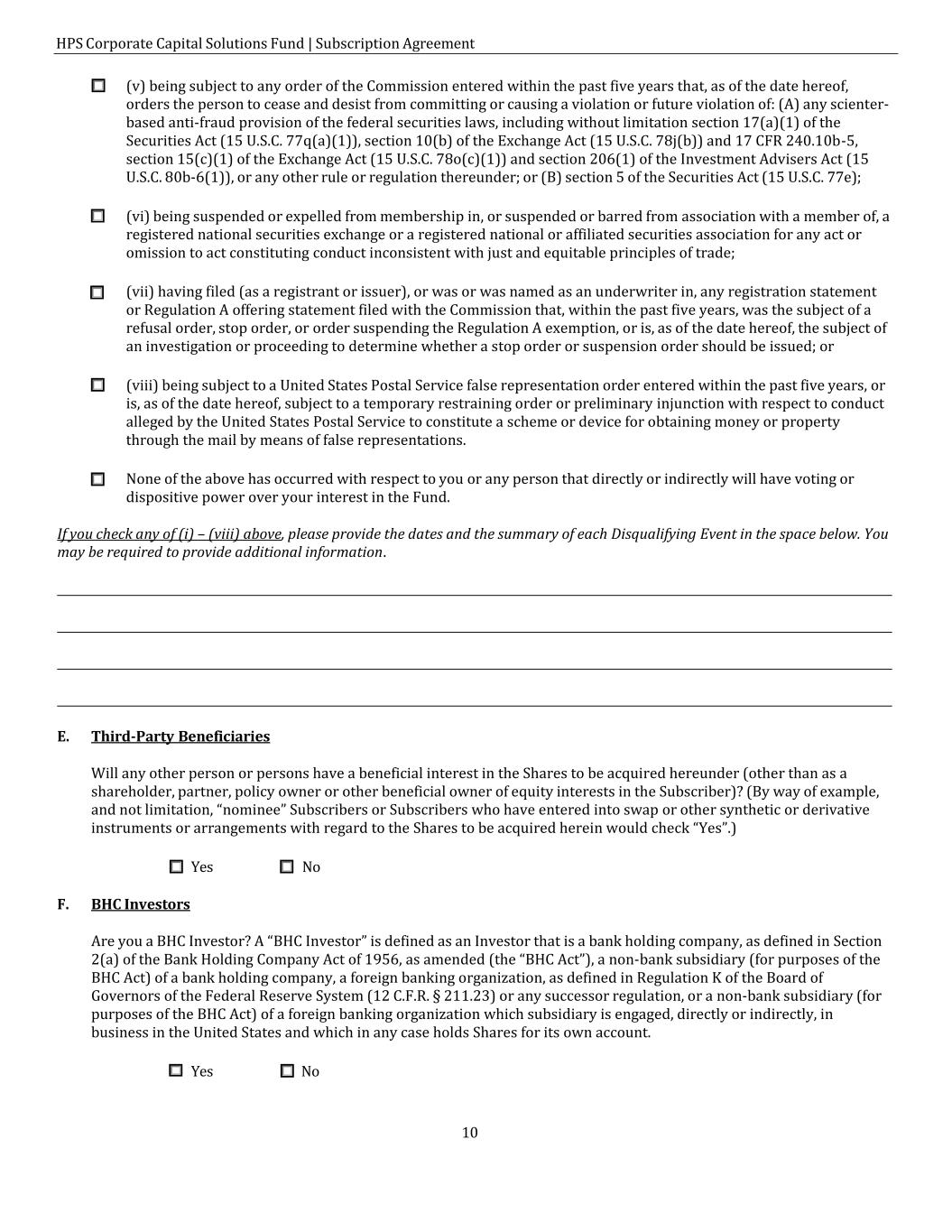 HPS Corporate Capital Solutions Fund | Subscription Agreement 10 ☐ (v) being subject to any order of the Commission entered within the past five years that, as of the date hereof, orders the person to cease and desist from committing or causing a violation or future violation of: (A) any scienter- based anti-fraud provision of the federal securities laws, including without limitation section 17(a)(1) of the Securities Act (15 U.S.C. 77q(a)(1)), section 10(b) of the Exchange Act (15 U.S.C. 78j(b)) and 17 CFR 240.10b-5, section 15(c)(1) of the Exchange Act (15 U.S.C. 78o(c)(1)) and section 206(1) of the Investment Advisers Act (15 U.S.C. 80b-6(1)), or any other rule or regulation thereunder; or (B) section 5 of the Securities Act (15 U.S.C. 77e); ☐ (vi) being suspended or expelled from membership in, or suspended or barred from association with a member of, a registered national securities exchange or a registered national or affiliated securities association for any act or omission to act constituting conduct inconsistent with just and equitable principles of trade; ☐ (vii) having filed (as a registrant or issuer), or was or was named as an underwriter in, any registration statement or Regulation A offering statement filed with the Commission that, within the past five years, was the subject of a refusal order, stop order, or order suspending the Regulation A exemption, or is, as of the date hereof, the subject of an investigation or proceeding to determine whether a stop order or suspension order should be issued; or ☐ (viii) being subject to a United States Postal Service false representation order entered within the past five years, or is, as of the date hereof, subject to a temporary restraining order or preliminary injunction with respect to conduct alleged by the United States Postal Service to constitute a scheme or device for obtaining money or property through the mail by means of false representations. ☐ None of the above has occurred with respect to you or any person that directly or indirectly will have voting or dispositive power over your interest in the Fund. If you check any of (i) – (viii) above, please provide the dates and the summary of each Disqualifying Event in the space below. You may be required to provide additional information. E. Third-Party Beneficiaries Will any other person or persons have a beneficial interest in the Shares to be acquired hereunder (other than as a shareholder, partner, policy owner or other beneficial owner of equity interests in the Subscriber)? (By way of example, and not limitation, “nominee” Subscribers or Subscribers who have entered into swap or other synthetic or derivative instruments or arrangements with regard to the Shares to be acquired herein would check “Yes”.) ☐ Yes ☐ No F. BHC Investors Are you a BHC Investor? A “BHC Investor” is defined as an Investor that is a bank holding company, as defined in Section 2(a) of the Bank Holding Company Act of 1956, as amended (the “BHC Act”), a non-bank subsidiary (for purposes of the BHC Act) of a bank holding company, a foreign banking organization, as defined in Regulation K of the Board of Governors of the Federal Reserve System (12 C.F.R. § 211.23) or any successor regulation, or a non-bank subsidiary (for purposes of the BHC Act) of a foreign banking organization which subsidiary is engaged, directly or indirectly, in business in the United States and which in any case holds Shares for its own account. ☐ Yes ☐ No