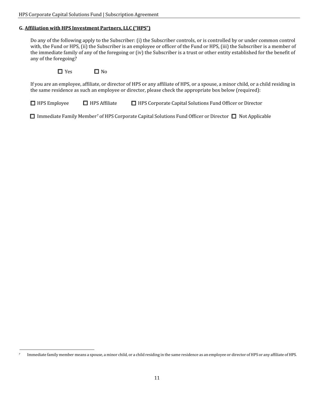 HPS Corporate Capital Solutions Fund | Subscription Agreement 11 G. Affiliation with HPS Investment Partners, LLC (“HPS”) Do any of the following apply to the Subscriber: (i) the Subscriber controls, or is controlled by or under common control with, the Fund or HPS, (ii) the Subscriber is an employee or officer of the Fund or HPS, (iii) the Subscriber is a member of the immediate family of any of the foregoing or (iv) the Subscriber is a trust or other entity established for the benefit of any of the foregoing? ☐ Yes ☐ No If you are an employee, affiliate, or director of HPS or any affiliate of HPS, or a spouse, a minor child, or a child residing in the same residence as such an employee or director, please check the appropriate box below (required): ☐ HPS Employee ☐ HPS Affiliate ☐ HPS Corporate Capital Solutions Fund Officer or Director ☐ Immediate Family Member7 of HPS Corporate Capital Solutions Fund Officer or Director ☐ Not Applicable 7 Immediate family member means a spouse, a minor child, or a child residing in the same residence as an employee or director of HPS or any affiliate of HPS.