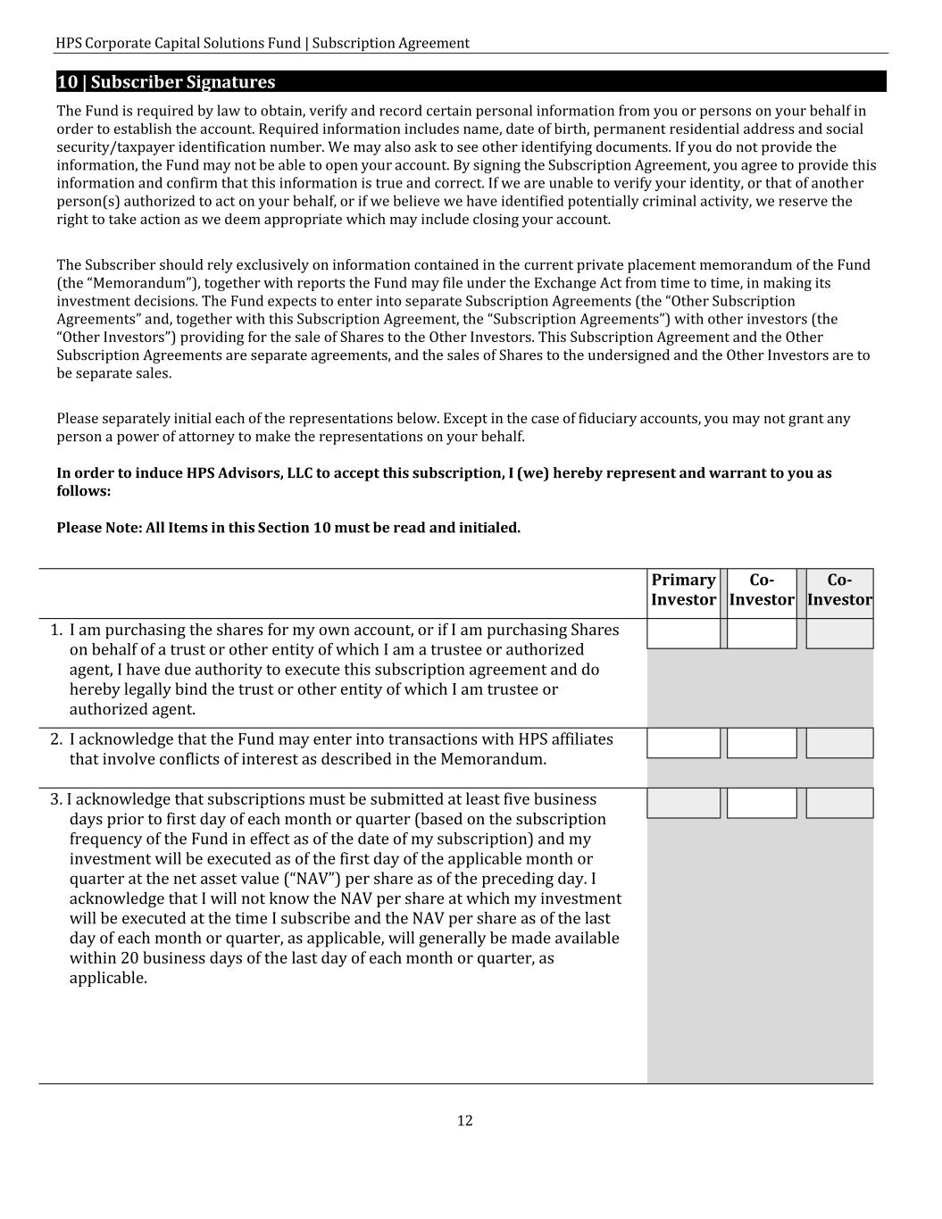 HPS Corporate Capital Solutions Fund | Subscription Agreement 12 10 | Subscriber Signatures The Fund is required by law to obtain, verify and record certain personal information from you or persons on your behalf in order to establish the account. Required information includes name, date of birth, permanent residential address and social security/taxpayer identification number. We may also ask to see other identifying documents. If you do not provide the information, the Fund may not be able to open your account. By signing the Subscription Agreement, you agree to provide this information and confirm that this information is true and correct. If we are unable to verify your identity, or that of another person(s) authorized to act on your behalf, or if we believe we have identified potentially criminal activity, we reserve the right to take action as we deem appropriate which may include closing your account. The Subscriber should rely exclusively on information contained in the current private placement memorandum of the Fund (the “Memorandum”), together with reports the Fund may file under the Exchange Act from time to time, in making its investment decisions. The Fund expects to enter into separate Subscription Agreements (the “Other Subscription Agreements” and, together with this Subscription Agreement, the “Subscription Agreements”) with other investors (the “Other Investors”) providing for the sale of Shares to the Other Investors. This Subscription Agreement and the Other Subscription Agreements are separate agreements, and the sales of Shares to the undersigned and the Other Investors are to be separate sales. Please separately initial each of the representations below. Except in the case of fiduciary accounts, you may not grant any person a power of attorney to make the representations on your behalf. In order to induce HPS Advisors, LLC to accept this subscription, I (we) hereby represent and warrant to you as follows: Please Note: All Items in this Section 10 must be read and initialed. Primary Investor Co- Investor Co- Investor 1. I am purchasing the shares for my own account, or if I am purchasing Shares on behalf of a trust or other entity of which I am a trustee or authorized agent, I have due authority to execute this subscription agreement and do hereby legally bind the trust or other entity of which I am trustee or authorized agent. 2. I acknowledge that the Fund may enter into transactions with HPS affiliates that involve conflicts of interest as described in the Memorandum. 3. I acknowledge that subscriptions must be submitted at least five business days prior to first day of each month or quarter (based on the subscription frequency of the Fund in effect as of the date of my subscription) and my investment will be executed as of the first day of the applicable month or quarter at the net asset value (“NAV”) per share as of the preceding day. I acknowledge that I will not know the NAV per share at which my investment will be executed at the time I subscribe and the NAV per share as of the last day of each month or quarter, as applicable, will generally be made available within 20 business days of the last day of each month or quarter, as applicable.