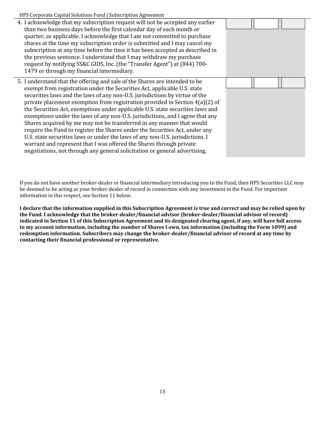HPS Corporate Capital Solutions Fund | Subscription Agreement 13 4. I acknowledge that my subscription request will not be accepted any earlier than two business days before the first calendar day of each month or quarter, as applicable. I acknowledge that I am not committed to purchase shares at the time my subscription order is submitted and I may cancel my subscription at any time before the time it has been accepted as described in the previous sentence. I understand that I may withdraw my purchase request by notifying SS&C GIDS, Inc. (the “Transfer Agent”) at (844) 700- 1479 or through my financial intermediary. 5. I understand that the offering and sale of the Shares are intended to be exempt from registration under the Securities Act, applicable U.S. state securities laws and the laws of any non-U.S. jurisdictions by virtue of the private placement exemption from registration provided in Section 4(a)(2) of the Securities Act, exemptions under applicable U.S. state securities laws and exemptions under the laws of any non-U.S. jurisdictions, and I agree that any Shares acquired by me may not be transferred in any manner that would require the Fund to register the Shares under the Securities Act, under any U.S. state securities laws or under the laws of any non-U.S. jurisdictions. I warrant and represent that I was offered the Shares through private negotiations, not through any general solicitation or general advertising. If you do not have another broker-dealer or financial intermediary introducing you to the Fund, then HPS Securities LLC may be deemed to be acting as your broker-dealer of record in connection with any investment in the Fund. For important information in this respect, see Section 11 below. I declare that the information supplied in this Subscription Agreement is true and correct and may be relied upon by the Fund. I acknowledge that the broker-dealer/financial advisor (broker-dealer/financial advisor of record) indicated in Section 11 of this Subscription Agreement and its designated clearing agent, if any, will have full access to my account information, including the number of Shares I own, tax information (including the Form 1099) and redemption information. Subscribers may change the broker-dealer/financial advisor of record at any time by contacting their financial professional or representative.