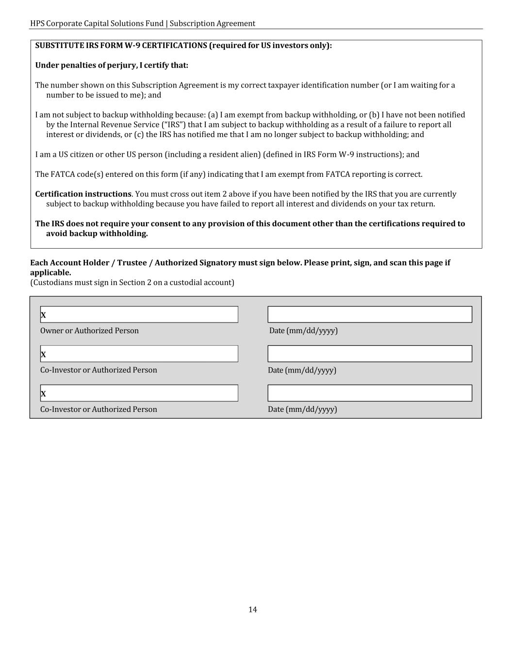 HPS Corporate Capital Solutions Fund | Subscription Agreement 14 Owner or Authorized Person Date (mm/dd/yyyy) Co-Investor or Authorized Person Date (mm/dd/yyyy) Co-Investor or Authorized Person Date (mm/dd/yyyy) Each Account Holder / Trustee / Authorized Signatory must sign below. Please print, sign, and scan this page if applicable. (Custodians must sign in Section 2 on a custodial account) SUBSTITUTE IRS FORM W-9 CERTIFICATIONS (required for US investors only): Under penalties of perjury, I certify that: The number shown on this Subscription Agreement is my correct taxpayer identification number (or I am waiting for a number to be issued to me); and I am not subject to backup withholding because: (a) I am exempt from backup withholding, or (b) I have not been notified by the Internal Revenue Service (“IRS”) that I am subject to backup withholding as a result of a failure to report all interest or dividends, or (c) the IRS has notified me that I am no longer subject to backup withholding; and I am a US citizen or other US person (including a resident alien) (defined in IRS Form W-9 instructions); and The FATCA code(s) entered on this form (if any) indicating that I am exempt from FATCA reporting is correct. Certification instructions. You must cross out item 2 above if you have been notified by the IRS that you are currently subject to backup withholding because you have failed to report all interest and dividends on your tax return. The IRS does not require your consent to any provision of this document other than the certifications required to avoid backup withholding.