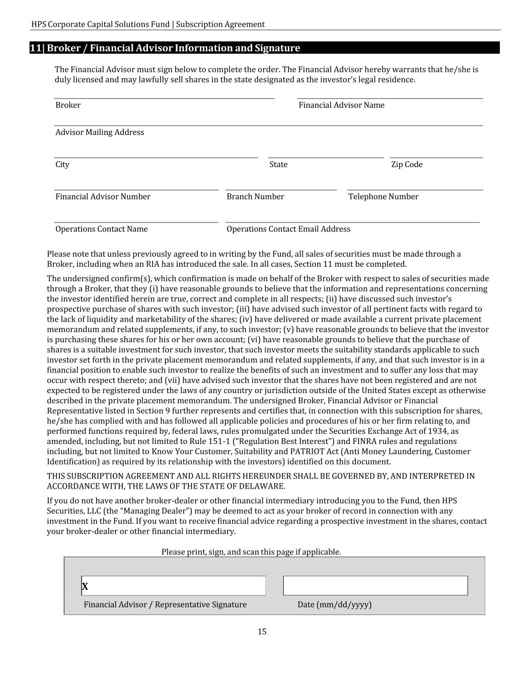 HPS Corporate Capital Solutions Fund | Subscription Agreement 15 Financial Advisor / Representative Signature Date (mm/dd/yyyy) 11| Broker / Financial Advisor Information and Signature The Financial Advisor must sign below to complete the order. The Financial Advisor hereby warrants that he/she is duly licensed and may lawfully sell shares in the state designated as the investor’s legal residence. Broker Financial Advisor Name Advisor Mailing Address City State Zip Code Financial Advisor Number Branch Number Telephone Number Operations Contact Name Operations Contact Email Address Please note that unless previously agreed to in writing by the Fund, all sales of securities must be made through a Broker, including when an RIA has introduced the sale. In all cases, Section 11 must be completed. The undersigned confirm(s), which confirmation is made on behalf of the Broker with respect to sales of securities made through a Broker, that they (i) have reasonable grounds to believe that the information and representations concerning the investor identified herein are true, correct and complete in all respects; (ii) have discussed such investor’s prospective purchase of shares with such investor; (iii) have advised such investor of all pertinent facts with regard to the lack of liquidity and marketability of the shares; (iv) have delivered or made available a current private placement memorandum and related supplements, if any, to such investor; (v) have reasonable grounds to believe that the investor is purchasing these shares for his or her own account; (vi) have reasonable grounds to believe that the purchase of shares is a suitable investment for such investor, that such investor meets the suitability standards applicable to such investor set forth in the private placement memorandum and related supplements, if any, and that such investor is in a financial position to enable such investor to realize the benefits of such an investment and to suffer any loss that may occur with respect thereto; and (vii) have advised such investor that the shares have not been registered and are not expected to be registered under the laws of any country or jurisdiction outside of the United States except as otherwise described in the private placement memorandum. The undersigned Broker, Financial Advisor or Financial Representative listed in Section 9 further represents and certifies that, in connection with this subscription for shares, he/she has complied with and has followed all applicable policies and procedures of his or her firm relating to, and performed functions required by, federal laws, rules promulgated under the Securities Exchange Act of 1934, as amended, including, but not limited to Rule 151-1 (“Regulation Best Interest”) and FINRA rules and regulations including, but not limited to Know Your Customer, Suitability and PATRIOT Act (Anti Money Laundering, Customer Identification) as required by its relationship with the investors) identified on this document. THIS SUBSCRIPTION AGREEMENT AND ALL RIGHTS HEREUNDER SHALL BE GOVERNED BY, AND INTERPRETED IN ACCORDANCE WITH, THE LAWS OF THE STATE OF DELAWARE. If you do not have another broker-dealer or other financial intermediary introducing you to the Fund, then HPS Securities, LLC (the “Managing Dealer”) may be deemed to act as your broker of record in connection with any investment in the Fund. If you want to receive financial advice regarding a prospective investment in the shares, contact your broker-dealer or other financial intermediary. Please print, sign, and scan this page if applicable.