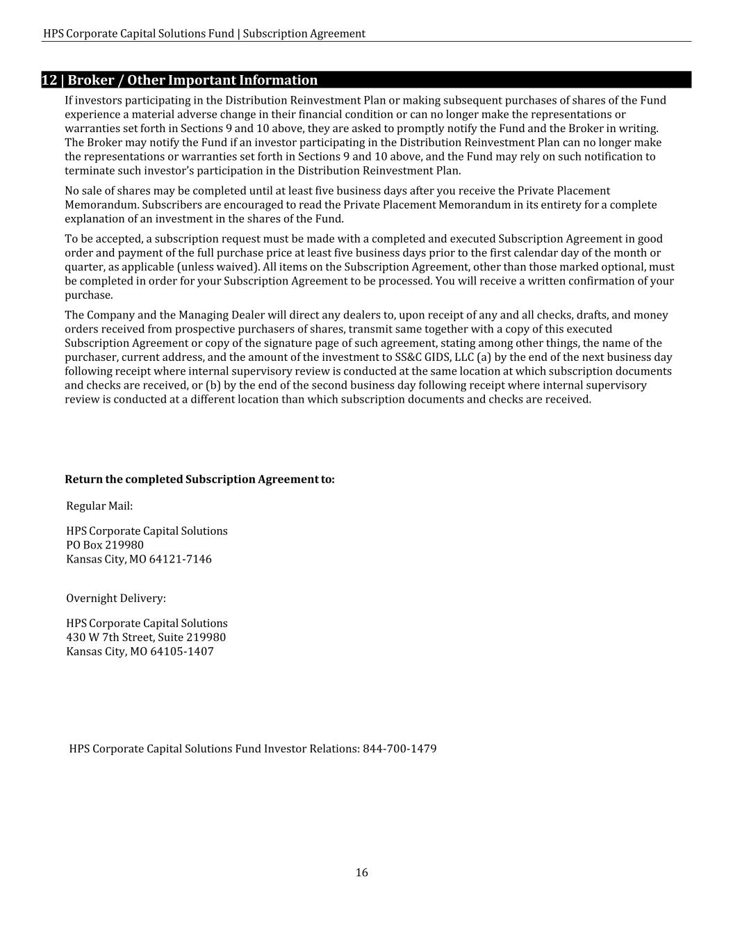 HPS Corporate Capital Solutions Fund | Subscription Agreement 16 If investors participating in the Distribution Reinvestment Plan or making subsequent purchases of shares of the Fund experience a material adverse change in their financial condition or can no longer make the representations or warranties set forth in Sections 9 and 10 above, they are asked to promptly notify the Fund and the Broker in writing. The Broker may notify the Fund if an investor participating in the Distribution Reinvestment Plan can no longer make the representations or warranties set forth in Sections 9 and 10 above, and the Fund may rely on such notification to terminate such investor’s participation in the Distribution Reinvestment Plan. No sale of shares may be completed until at least five business days after you receive the Private Placement Memorandum. Subscribers are encouraged to read the Private Placement Memorandum in its entirety for a complete explanation of an investment in the shares of the Fund. To be accepted, a subscription request must be made with a completed and executed Subscription Agreement in good order and payment of the full purchase price at least five business days prior to the first calendar day of the month or quarter, as applicable (unless waived). All items on the Subscription Agreement, other than those marked optional, must be completed in order for your Subscription Agreement to be processed. You will receive a written confirmation of your purchase. The Company and the Managing Dealer will direct any dealers to, upon receipt of any and all checks, drafts, and money orders received from prospective purchasers of shares, transmit same together with a copy of this executed Subscription Agreement or copy of the signature page of such agreement, stating among other things, the name of the purchaser, current address, and the amount of the investment to SS&C GIDS, LLC (a) by the end of the next business day following receipt where internal supervisory review is conducted at the same location at which subscription documents and checks are received, or (b) by the end of the second business day following receipt where internal supervisory review is conducted at a different location than which subscription documents and checks are received. Return the completed Subscription Agreement to: Regular Mail: HPS Corporate Capital Solutions PO Box 219980 Kansas City, MO 64121-7146 Overnight Delivery: HPS Corporate Capital Solutions 430 W 7th Street, Suite 219980 Kansas City, MO 64105-1407 12 | Broker / Other Important Information HPS Corporate Capital Solutions Fund Investor Relations: 844-700-1479