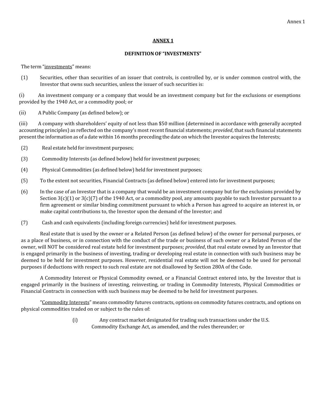 Annex 1 ANNEX 1 DEFINITION OF “INVESTMENTS” The term “investments” means: (1) Securities, other than securities of an issuer that controls, is controlled by, or is under common control with, the Investor that owns such securities, unless the issuer of such securities is: (i) An investment company or a company that would be an investment company but for the exclusions or exemptions provided by the 1940 Act, or a commodity pool; or (ii) A Public Company (as defined below); or (iii) A company with shareholders’ equity of not less than $50 million (determined in accordance with generally accepted accounting principles) as reflected on the company’s most recent financial statements; provided, that such financial statements present the information as of a date within 16 months preceding the date on which the Investor acquires the Interests; (2) Real estate held for investment purposes; (3) Commodity Interests (as defined below) held for investment purposes; (4) Physical Commodities (as defined below) held for investment purposes; (5) To the extent not securities, Financial Contracts (as defined below) entered into for investment purposes; (6) In the case of an Investor that is a company that would be an investment company but for the exclusions provided by Section 3(c)(1) or 3(c)(7) of the 1940 Act, or a commodity pool, any amounts payable to such Investor pursuant to a firm agreement or similar binding commitment pursuant to which a Person has agreed to acquire an interest in, or make capital contributions to, the Investor upon the demand of the Investor; and (7) Cash and cash equivalents (including foreign currencies) held for investment purposes. Real estate that is used by the owner or a Related Person (as defined below) of the owner for personal purposes, or as a place of business, or in connection with the conduct of the trade or business of such owner or a Related Person of the owner, will NOT be considered real estate held for investment purposes; provided, that real estate owned by an Investor that is engaged primarily in the business of investing, trading or developing real estate in connection with such business may be deemed to be held for investment purposes. However, residential real estate will not be deemed to be used for personal purposes if deductions with respect to such real estate are not disallowed by Section 280A of the Code. A Commodity Interest or Physical Commodity owned, or a Financial Contract entered into, by the Investor that is engaged primarily in the business of investing, reinvesting, or trading in Commodity Interests, Physical Commodities or Financial Contracts in connection with such business may be deemed to be held for investment purposes. “Commodity Interests” means commodity futures contracts, options on commodity futures contracts, and options on physical commodities traded on or subject to the rules of: (i) Any contract market designated for trading such transactions under the U.S. Commodity Exchange Act, as amended, and the rules thereunder; or