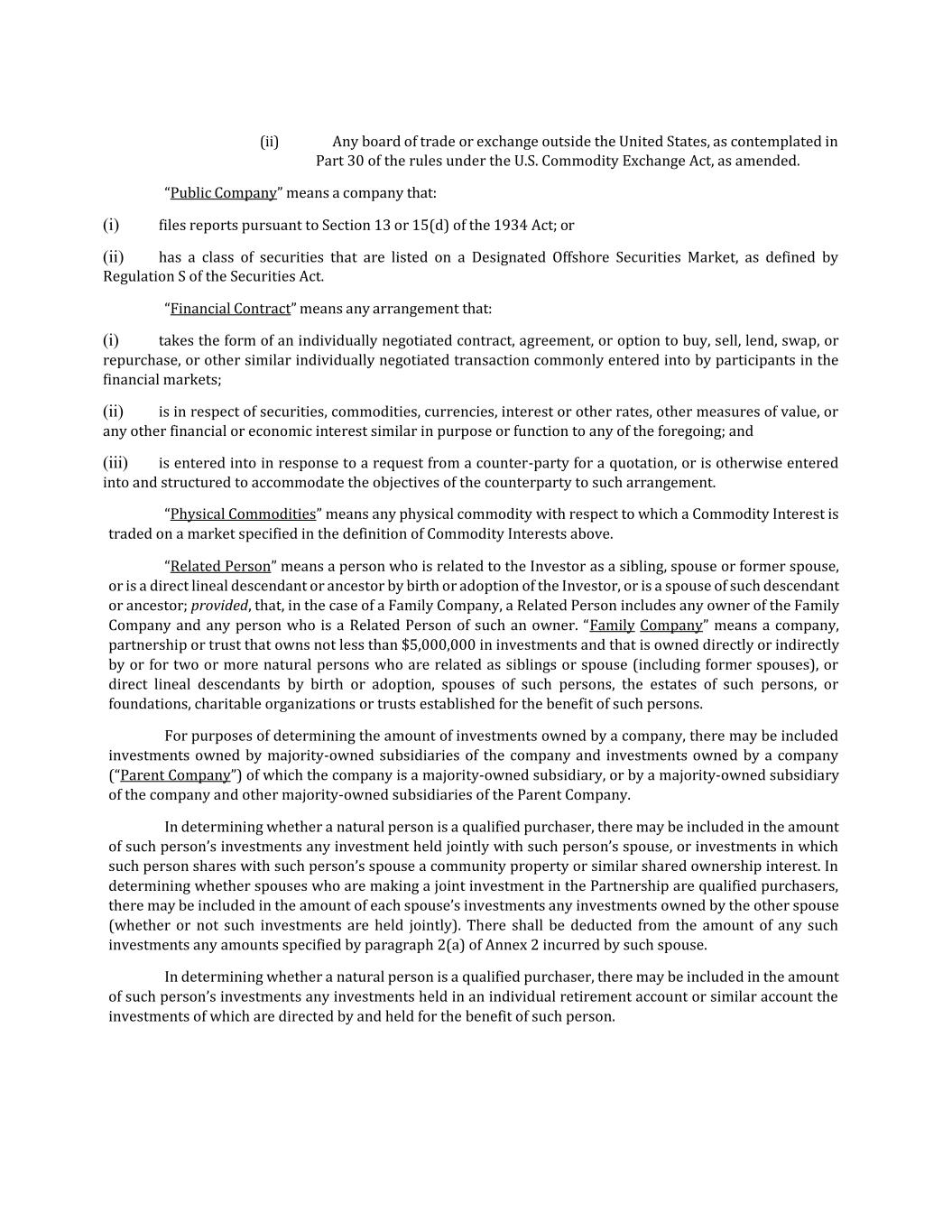 (ii) Any board of trade or exchange outside the United States, as contemplated in Part 30 of the rules under the U.S. Commodity Exchange Act, as amended. “Public Company” means a company that: (i) files reports pursuant to Section 13 or 15(d) of the 1934 Act; or (ii) has a class of securities that are listed on a Designated Offshore Securities Market, as defined by Regulation S of the Securities Act. “Financial Contract” means any arrangement that: (i) takes the form of an individually negotiated contract, agreement, or option to buy, sell, lend, swap, or repurchase, or other similar individually negotiated transaction commonly entered into by participants in the financial markets; (ii) is in respect of securities, commodities, currencies, interest or other rates, other measures of value, or any other financial or economic interest similar in purpose or function to any of the foregoing; and (iii) is entered into in response to a request from a counter-party for a quotation, or is otherwise entered into and structured to accommodate the objectives of the counterparty to such arrangement. “Physical Commodities” means any physical commodity with respect to which a Commodity Interest is traded on a market specified in the definition of Commodity Interests above. “Related Person” means a person who is related to the Investor as a sibling, spouse or former spouse, or is a direct lineal descendant or ancestor by birth or adoption of the Investor, or is a spouse of such descendant or ancestor; provided, that, in the case of a Family Company, a Related Person includes any owner of the Family Company and any person who is a Related Person of such an owner. “Family Company” means a company, partnership or trust that owns not less than $5,000,000 in investments and that is owned directly or indirectly by or for two or more natural persons who are related as siblings or spouse (including former spouses), or direct lineal descendants by birth or adoption, spouses of such persons, the estates of such persons, or foundations, charitable organizations or trusts established for the benefit of such persons. For purposes of determining the amount of investments owned by a company, there may be included investments owned by majority-owned subsidiaries of the company and investments owned by a company (“Parent Company”) of which the company is a majority-owned subsidiary, or by a majority-owned subsidiary of the company and other majority-owned subsidiaries of the Parent Company. In determining whether a natural person is a qualified purchaser, there may be included in the amount of such person’s investments any investment held jointly with such person’s spouse, or investments in which such person shares with such person’s spouse a community property or similar shared ownership interest. In determining whether spouses who are making a joint investment in the Partnership are qualified purchasers, there may be included in the amount of each spouse’s investments any investments owned by the other spouse (whether or not such investments are held jointly). There shall be deducted from the amount of any such investments any amounts specified by paragraph 2(a) of Annex 2 incurred by such spouse. In determining whether a natural person is a qualified purchaser, there may be included in the amount of such person’s investments any investments held in an individual retirement account or similar account the investments of which are directed by and held for the benefit of such person.