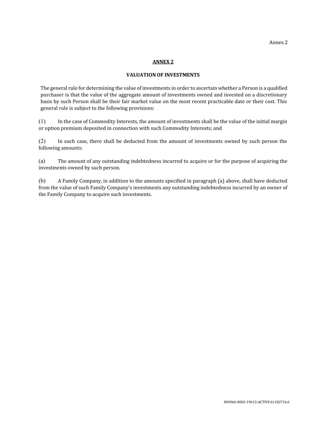 Annex 2 ANNEX 2 VALUATION OF INVESTMENTS The general rule for determining the value of investments in order to ascertain whether a Person is a qualified purchaser is that the value of the aggregate amount of investments owned and invested on a discretionary basis by such Person shall be their fair market value on the most recent practicable date or their cost. This general rule is subject to the following provisions: (1) In the case of Commodity Interests, the amount of investments shall be the value of the initial margin or option premium deposited in connection with such Commodity Interests; and (2) In each case, there shall be deducted from the amount of investments owned by such person the following amounts: (a) The amount of any outstanding indebtedness incurred to acquire or for the purpose of acquiring the investments owned by such person. (b) A Family Company, in addition to the amounts specified in paragraph (a) above, shall have deducted from the value of such Family Company’s investments any outstanding indebtedness incurred by an owner of the Family Company to acquire such investments. 004966-0002-19613-ACTIVE.61182716.6
